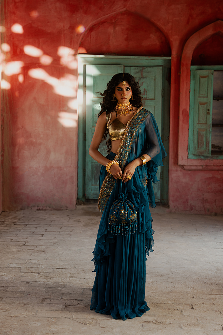 Gold foil zari blouse with adjustable back dori. Teal chiffon 12-yard lehenga. Teal chiffon frill...