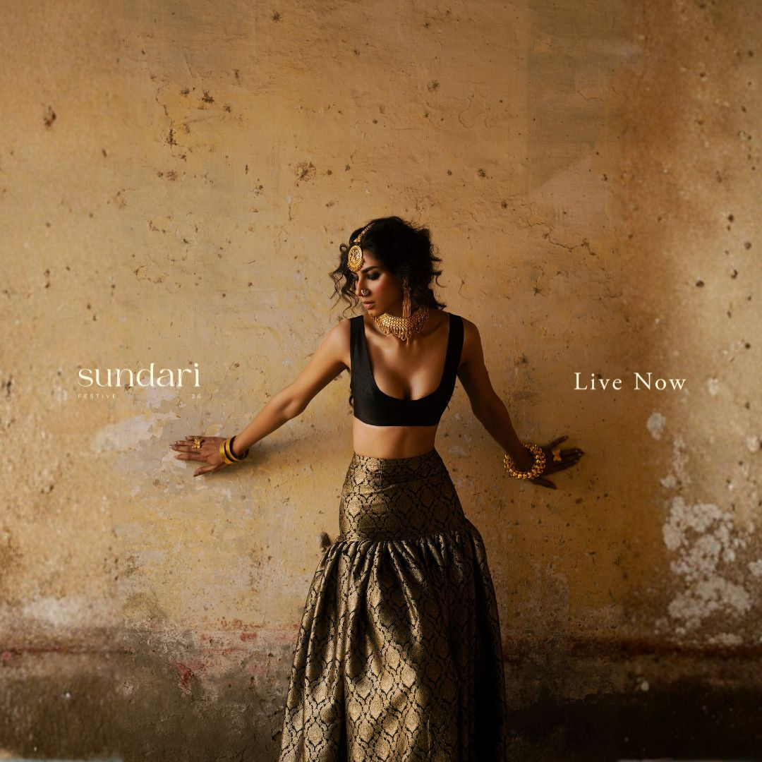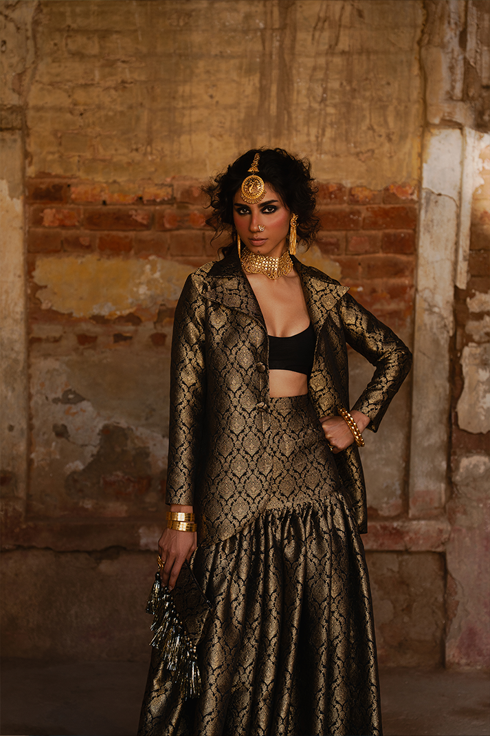 Black raw silk blouse. Black banarsi 8-yard high waist gathered lehnga with adjustable back dori...