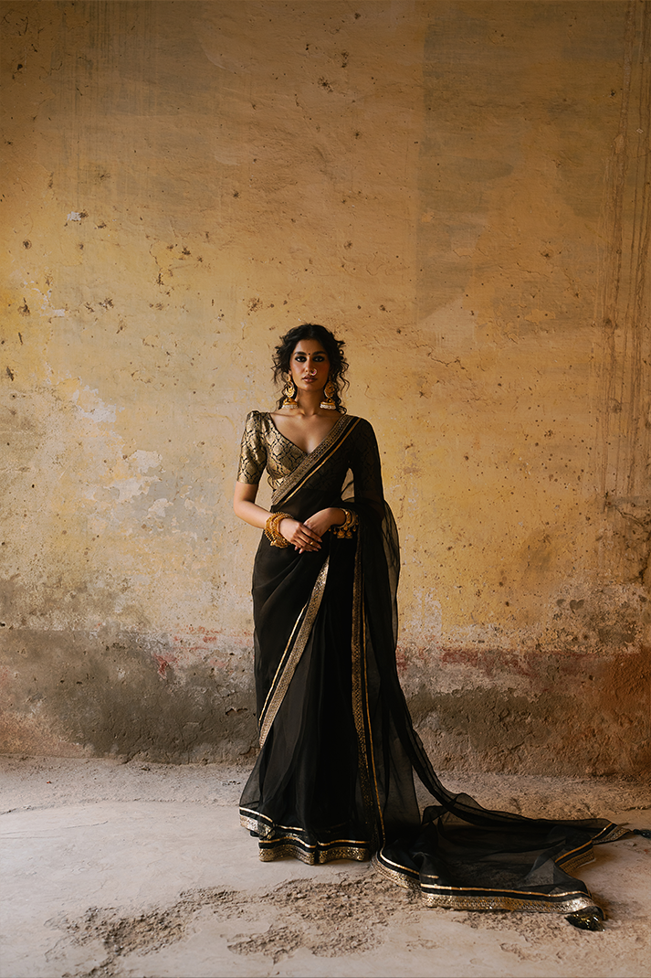 Single-piece black organza saree with a black banarsi blouse. Black sheer chiffon at the waist....