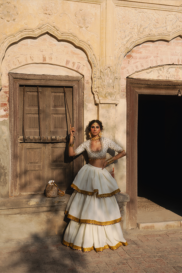 White raw silk tilla and sequin embroidered blouse enhanced with ball detailing. White 3-tier lehnga...