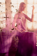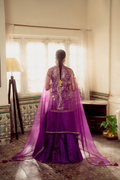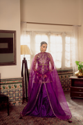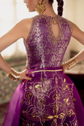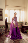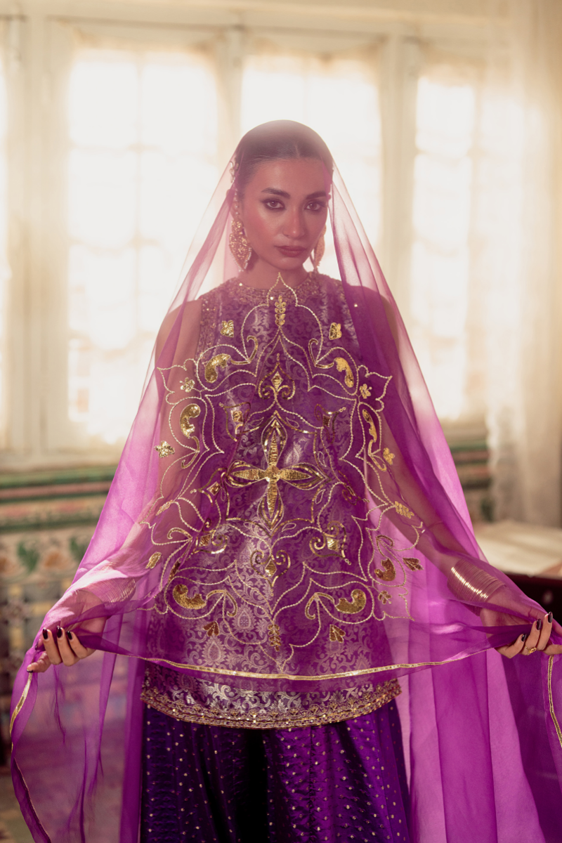 - Purple banarsi short shirt with golden tilla and sequin embroidery, enhanced with handwork.