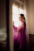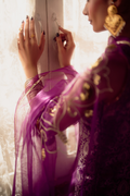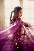 - Purple organza dupatta featuring an embroidered motif with gota lace finish and tassle hangings.