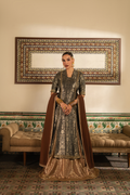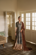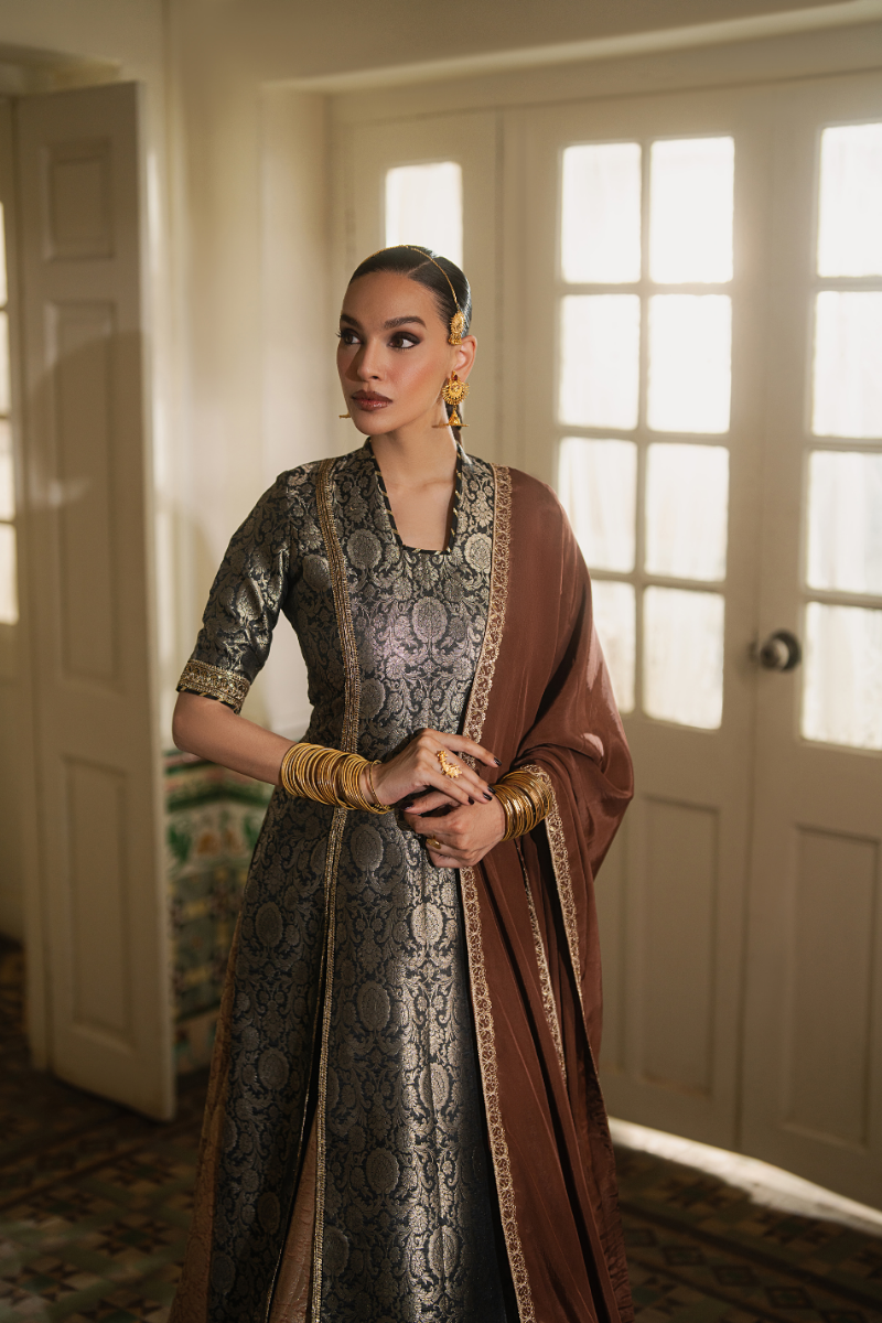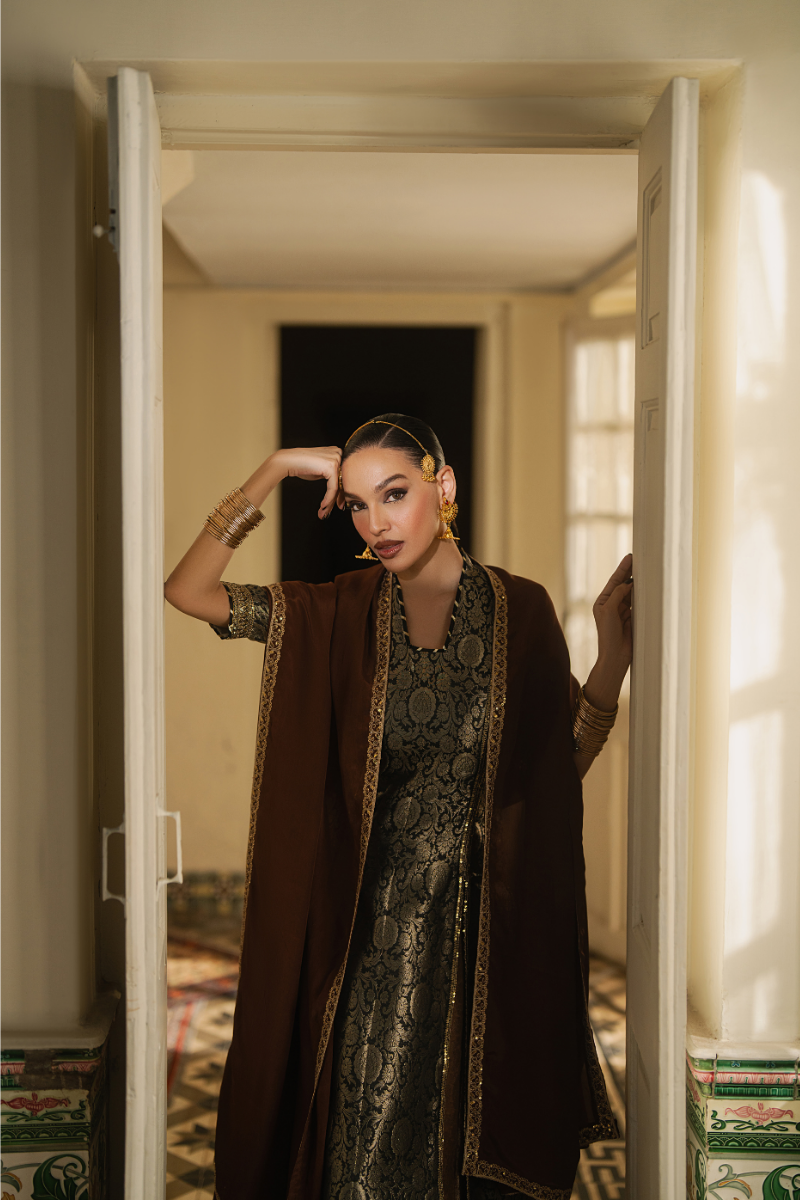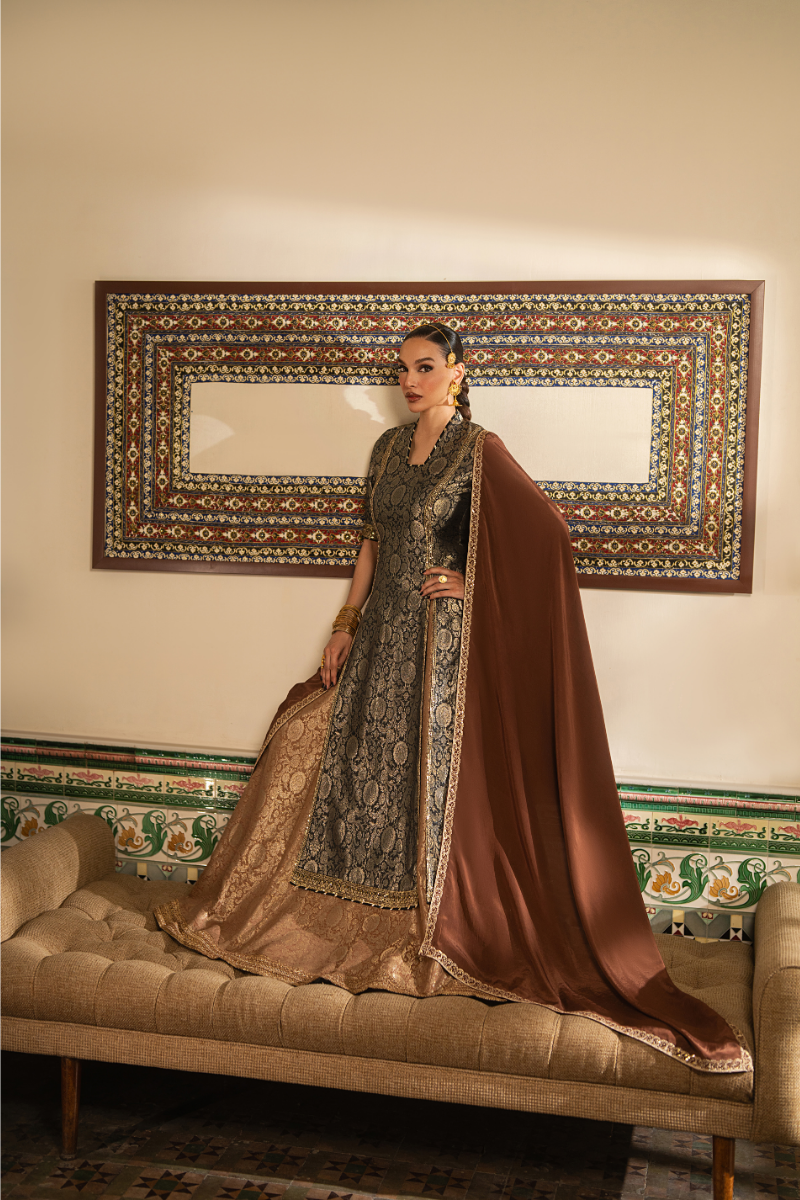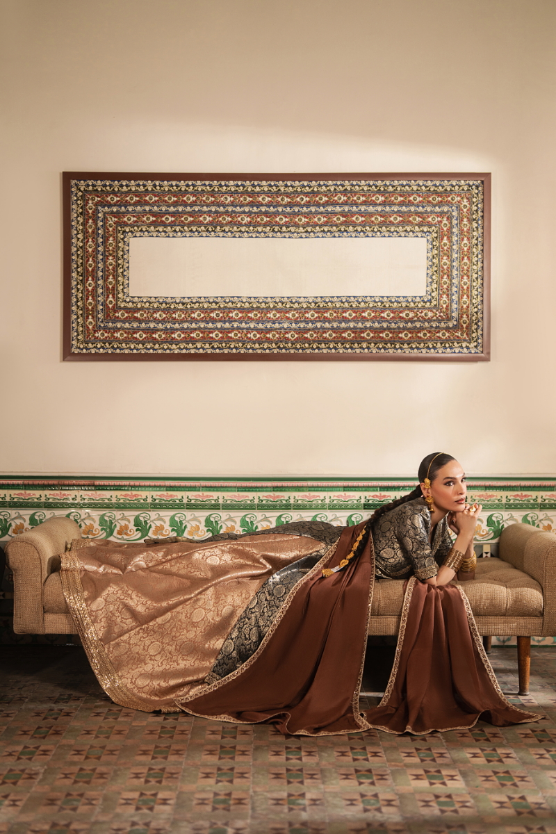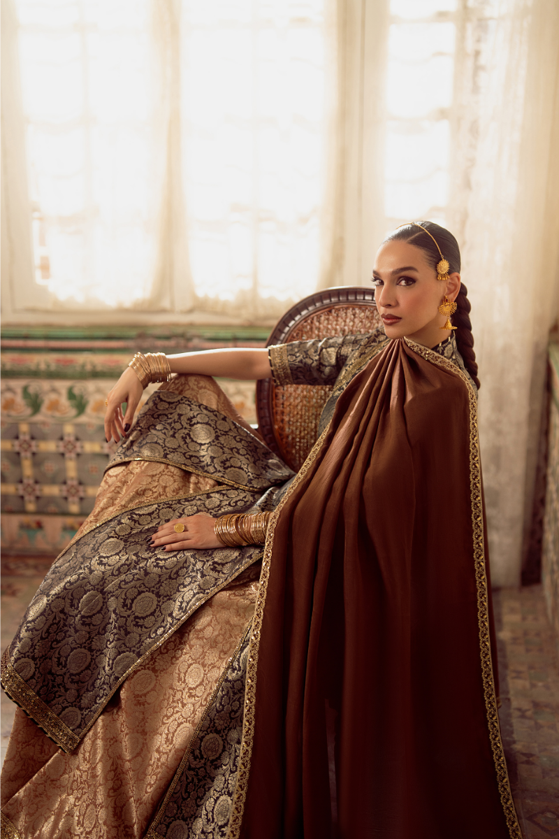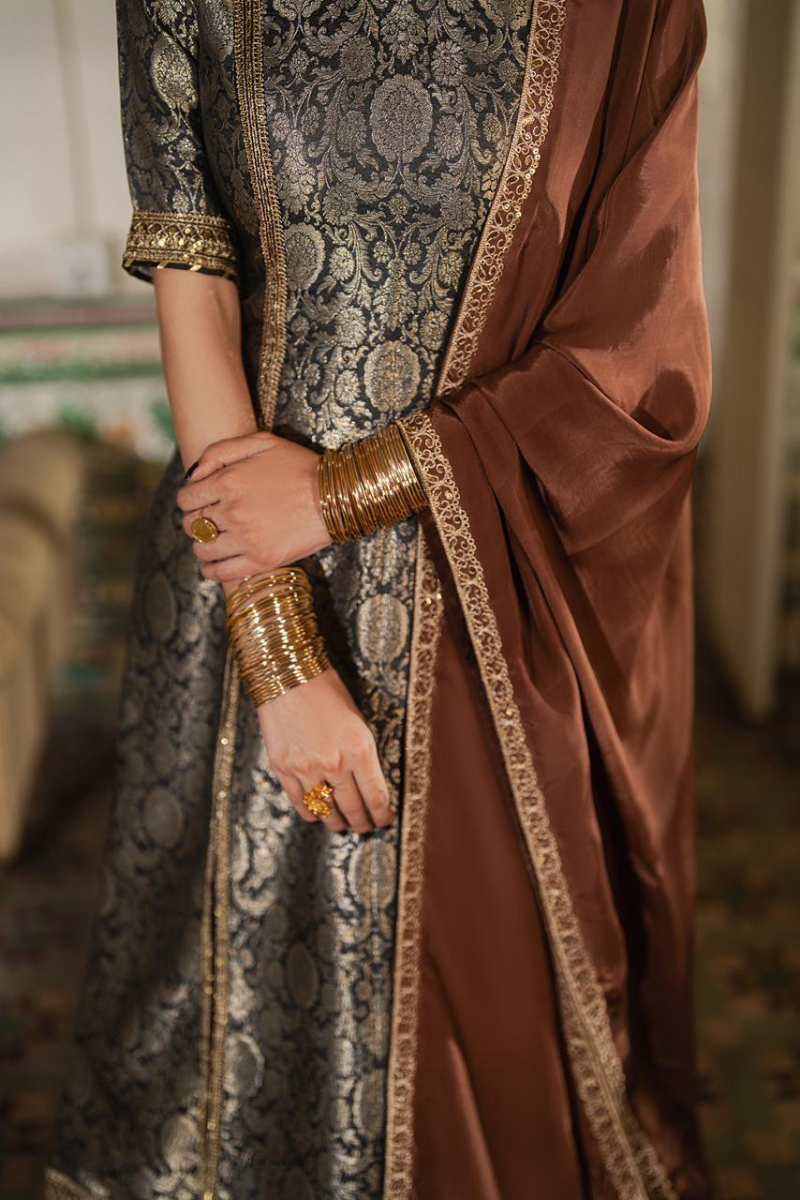 - Brown banarsi lehnga with golden tilla and sequin embroidery.