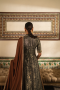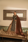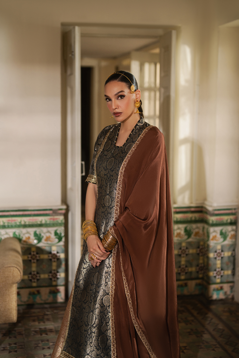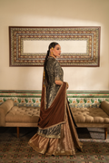 - Brown silk dupatta with golden tilla and sequin embroidery.