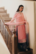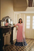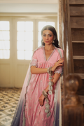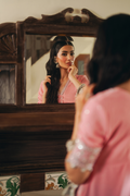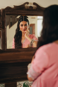 - Candy pink velvet long shirt with silver tilla and sequin embroidery, enhanced with handwork.