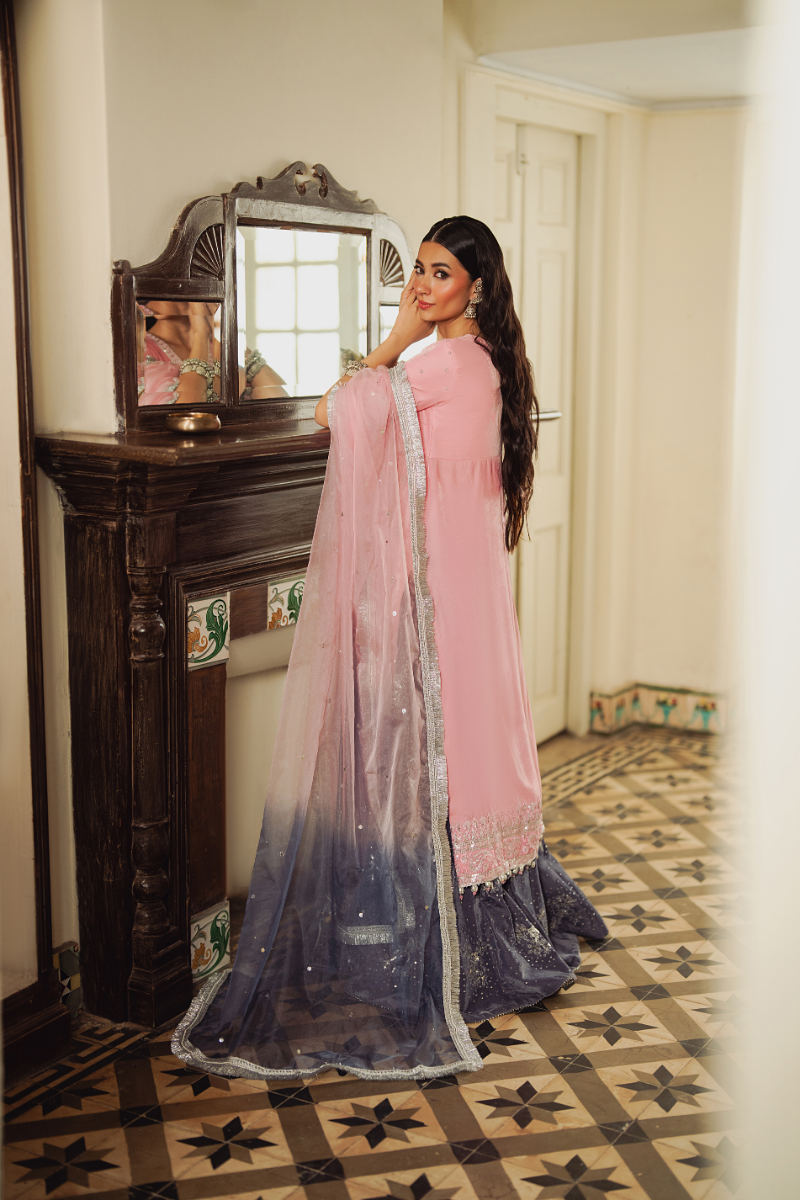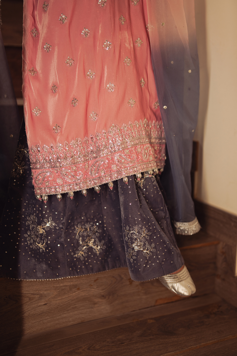 - Double-shaded organza kamdani dupatta, finished with kiran.